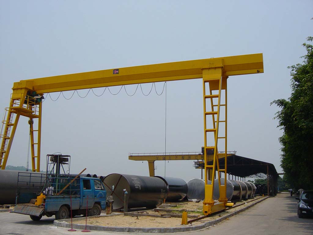 它的金屬結(jié)構(gòu)像門形框架,承載主梁下安裝兩條支腳,可以直接在地面的軌道上行走,主梁兩端可以具有外伸懸臂梁。