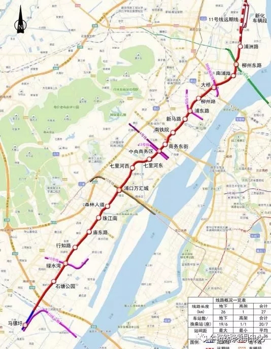 11號線一期具體站點:馬騾圩、石塘公園、綠水灣、行知路、廟東路、珠江南、森林大道、浦口萬江城、七里河西、七里河?xùn)|、中央商務(wù)區(qū)、商務(wù)東街、南鐵院、新馬路、浦東路、柳州路、大橋、南浦路站、柳州東路、浦州路站。