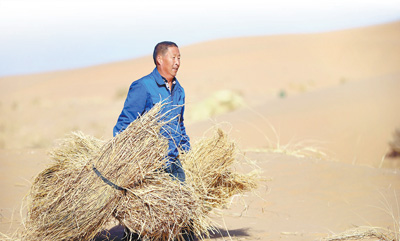 圖為甘肅古浪縣北部沙區(qū)旱麻崗治沙點,一位治沙人在搬運稻草(攝于今年3月)。馬希平攝(新華社發(fā))