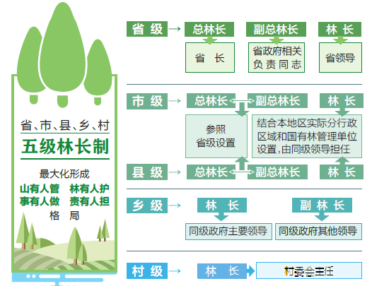 《意見》要求分級設(shè)立林長。省級設(shè)立總林長、副總林長和林長,其中總林長由省長擔(dān)任、副總林長由省政府相關(guān)負(fù)責(zé)同志擔(dān)任、林長由省領(lǐng)導(dǎo)擔(dān)任。市、縣兩級分別設(shè)立總林長、副總林長和林長,其中總林長、副總林長參照省級設(shè)置,林長結(jié)合本地區(qū)實際分行政區(qū)域和國有林管理單位設(shè)置,由同級領(lǐng)導(dǎo)擔(dān)任。鄉(xiāng)級設(shè)置林長、副林長,林長由同級政府主要領(lǐng)導(dǎo)擔(dān)任,副林長由同級政府其他領(lǐng)導(dǎo)擔(dān)任。村級設(shè)置林長,由村委會主任擔(dān)任。