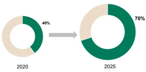 為支持全球能源轉(zhuǎn)型和可持續(xù)發(fā)展,勝科致力于將可持續(xù)解決方案資產(chǎn)的利潤(rùn)貢獻(xiàn)從目前的40%到2025年增長(zhǎng)為70%。到2025年,可再生能源資產(chǎn)的目標(biāo)為實(shí)現(xiàn)30%的年均復(fù)合增長(zhǎng)率,綜合性城鎮(zhèn)解決方案資產(chǎn)為10%。